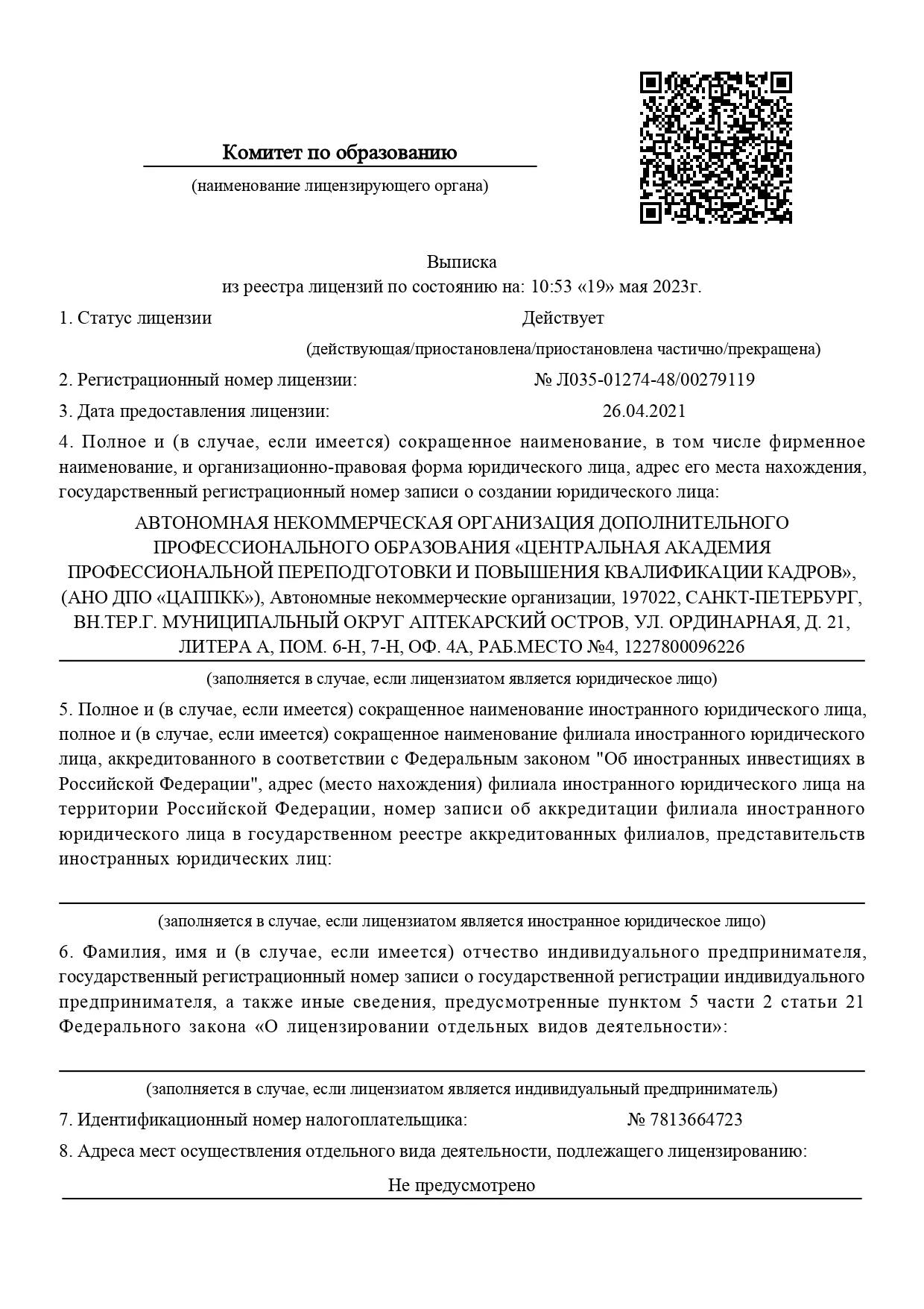 Введите в строку поиска ИНН АНО ДПО «ЦАППКК» 7813664723 и нажмите на кнопку «Поиск».
