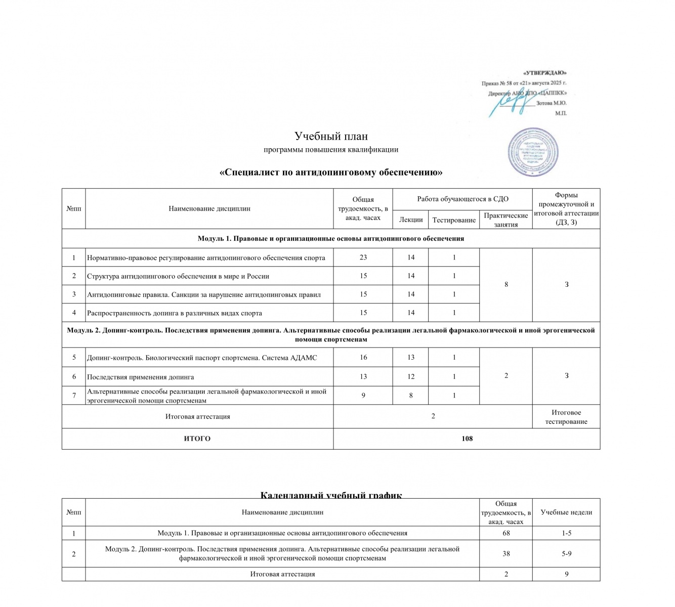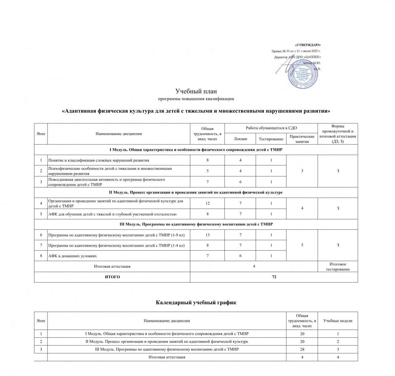 «Адаптивная физическая культура и спорт: организация и проведение практических занятий и тренировок с лицами, имеющими ограниченные возможности здоровья» с присвоением квалификации «Инструктор-методист по адаптивной физической культуре и адаптивному спорту. Тренер-преподаватель по адаптивной физической культуре и адаптивному спорту» |