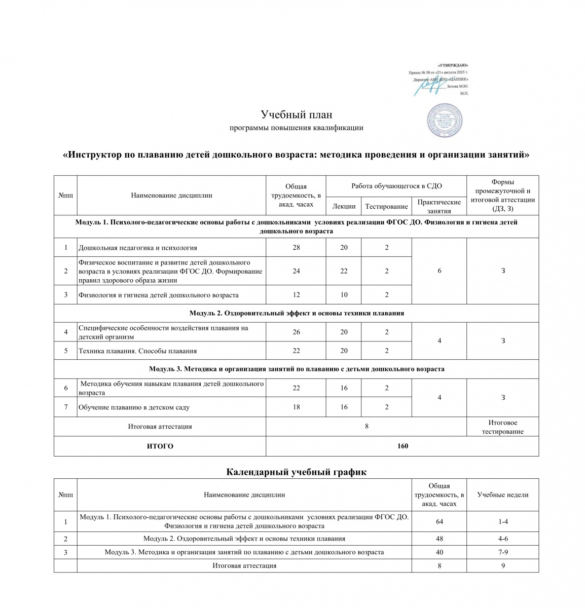 «Инструктор по плаванию детей раннего и дошкольного возраста. Планирование и организация физкультурно-оздоровительной деятельности по плаванию с детьми раннего и дошкольного возраста» с присвоением квалификации «Инструктор по плаванию детей раннего и дошкольного возраста» |