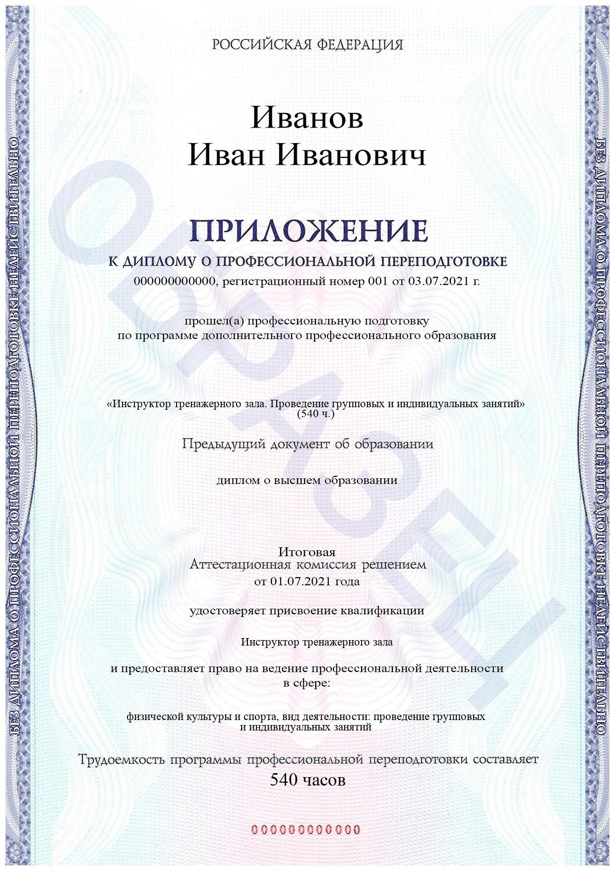По окончании обучения вы получите диплом установленного образца с присвоением квалификации «Инструктор тренажерного зала», дающий право на ведение профессиональной деятельности. Вы сможете работать в фитнес-клубах и спортивных центрах, вести частную практику, проводить как индивидуальные, так и групповые занятия.