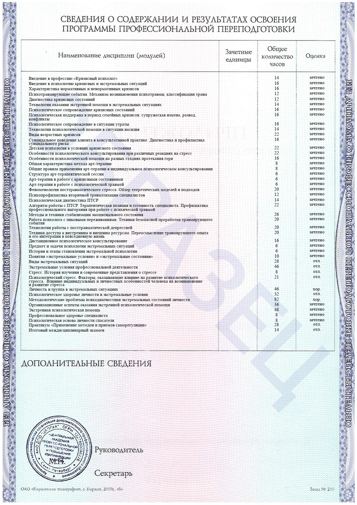 Качественное обучение в ЦАППКК поможет стать высококлассным специалистом и экспертом в своем деле. На курсе вы изучите виды кризисных и экстремальных ситуаций, их влияние на психику человека, овладеете современными методами диагностики психического состояния в кризисной ситуации и посттравматических расстройств, усвоите алгоритмы оказания экстренной помощи на разных этапах. Научитесь применять различные методы и техники стабилизации эмоционального состояния, подключать арт-терапевтические приемы, проводить дистанционные консультации.