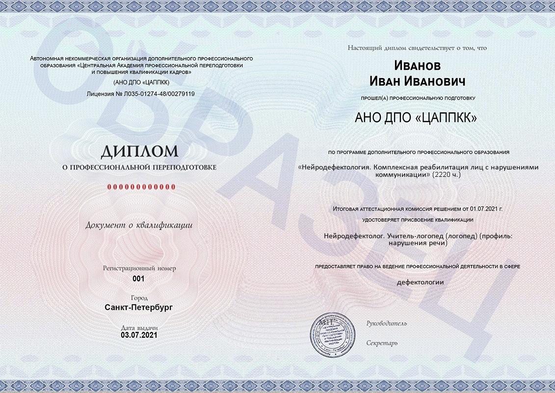 Курс по нейродефектологии в ЦАППКК дает возможность освоить востребованное направление и получить диплом о профессиональной переподготовке установленного образца с двумя квалификациями: «Нейродефектолог» и «Учитель-логопед». Это экономит время и деньги, открывает больше профессиональных возможностей.