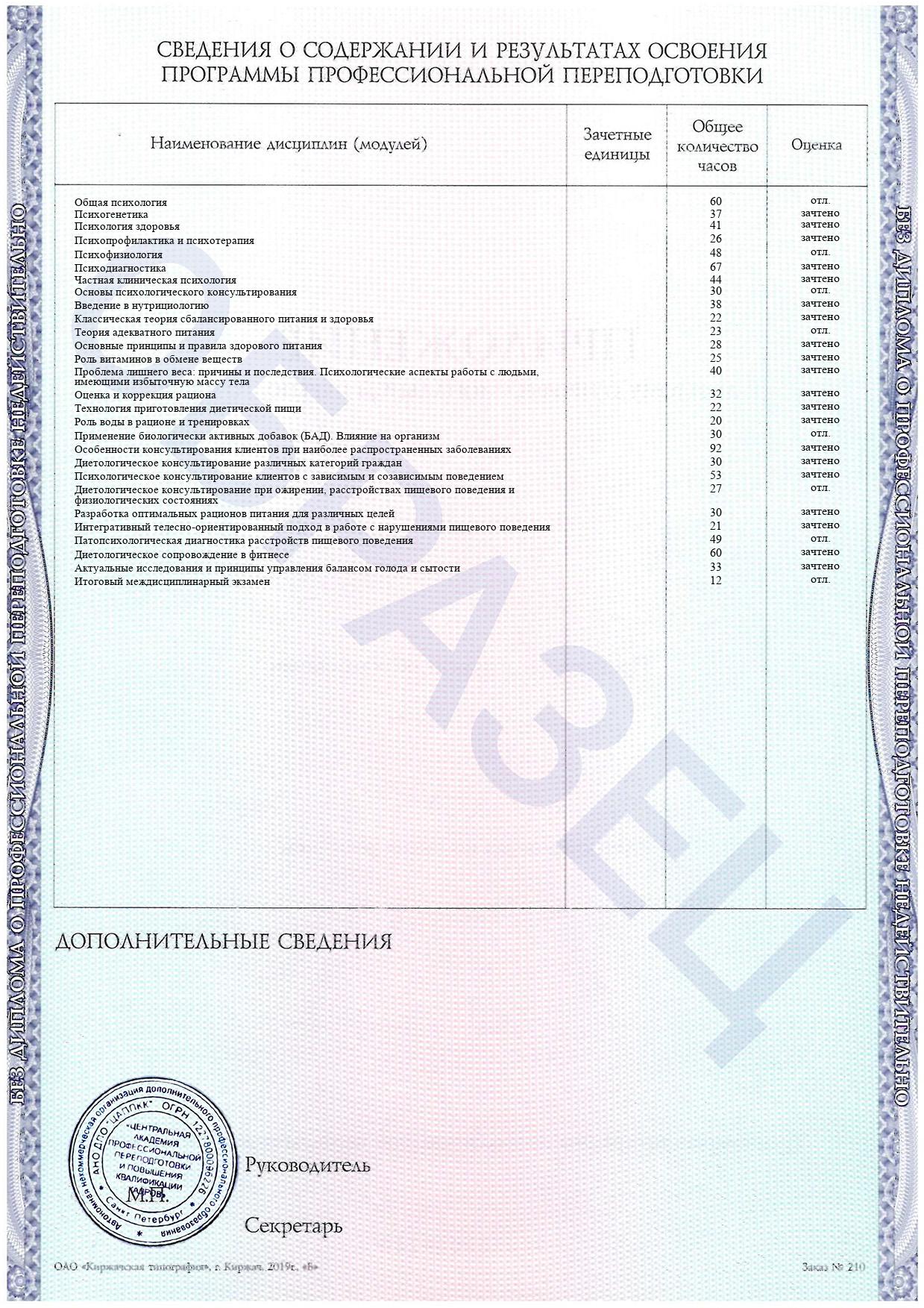 По окончании обучения вы получите диплом установленного образца, дающий право на ведение профессиональной деятельности в сфере консультирования по вопросам пищевого поведения. Вы сможете вести частную практику, работать в реабилитационных центрах, сотрудничать с клиниками снижения веса и фитнес-клубами.