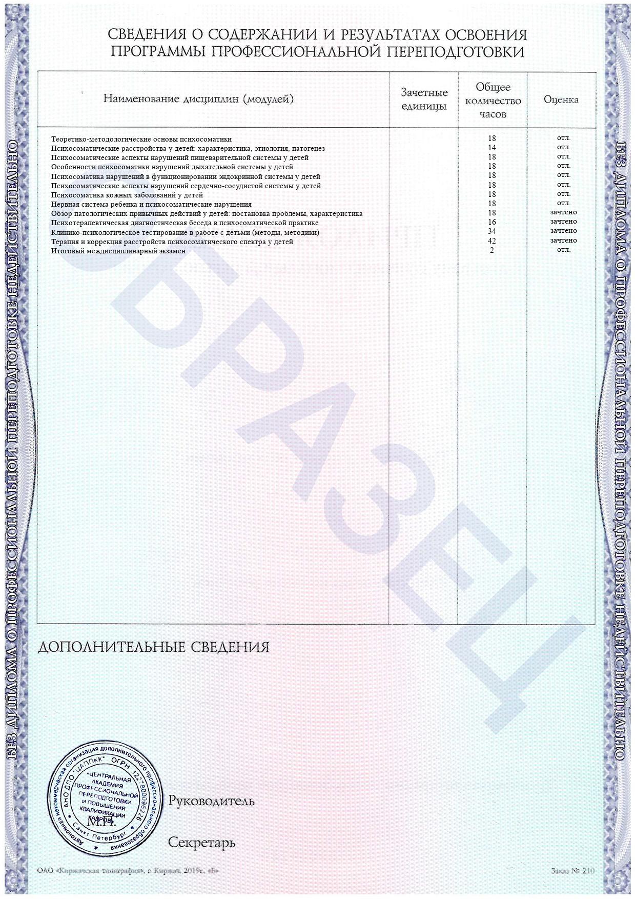 В результате обучения вы освоите навыки диагностики, терапии и профилактики психосоматических нарушений. Эти знания позволят вам помогать детям комплексно, улучшая их состояние и качество жизни. После итоговой аттестации вы получите диплом установленного образца.